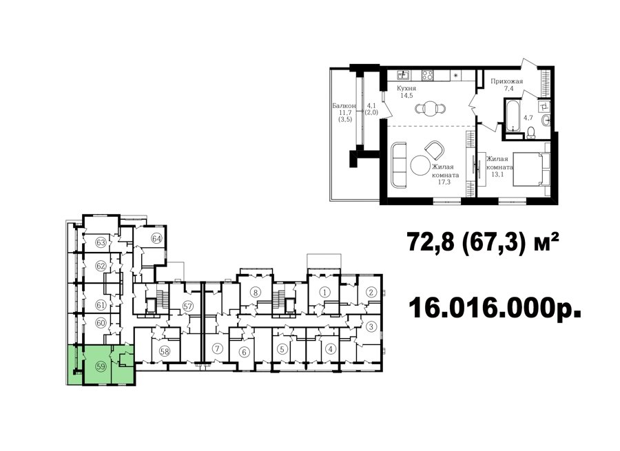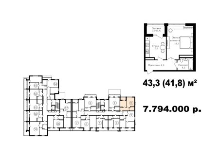 Широкий выбор студий, однокомнатных и двухкомнатных квартир от 35 м2 до 70 м2. Все квартиры имеют балкон. Серым цветом обозначены студии, желтым- однокомнатные, зеленым- евродвушки, красным- полноценные двухкомнатные квартиры.